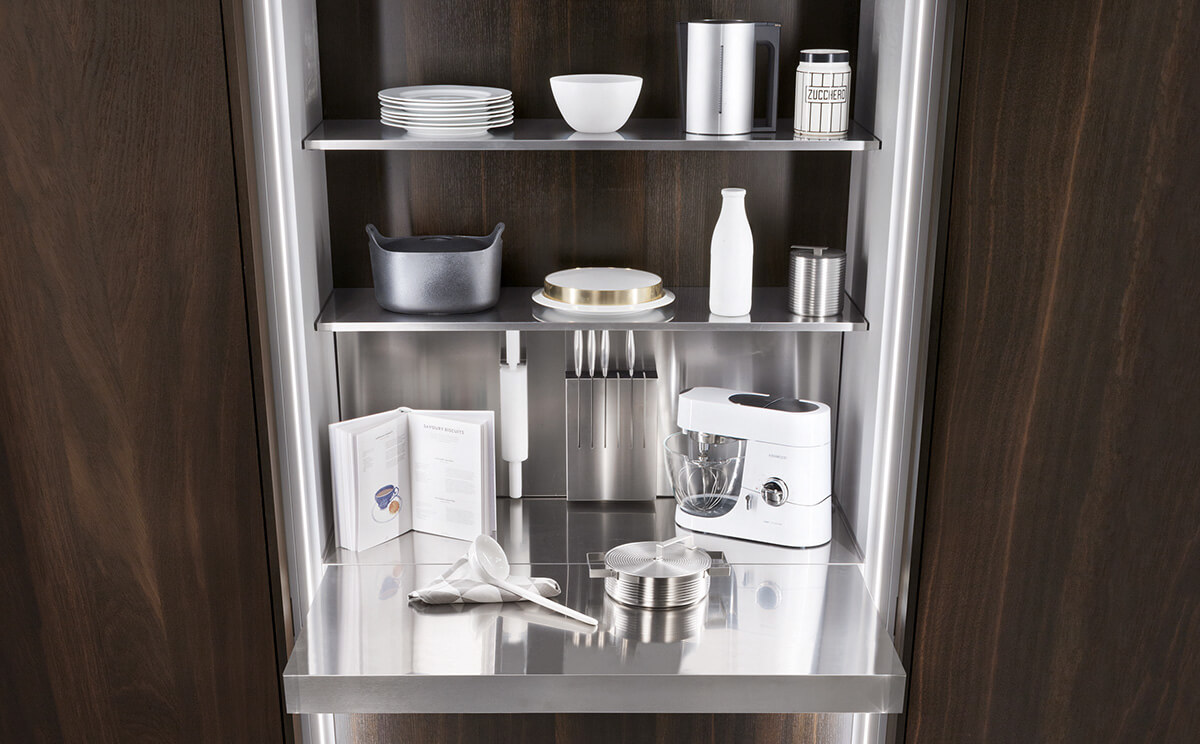 Without research and innovation, products remain on the threshold of the ordinary. ernestomeda takes both areas seriously and is one step ahead of other kitchen designers. Fold-out shelves and surprisingly lowerable sliding doors are more than just technical gags. The selection of materials, fittings, floating shelf boards and the stainless steel doors are all a demonstration of the company’s visual expertise. But it is not just the design that is captivating. With the many functional details concealed behind the surfaces, ernestomeda kitchens also prove their value in practice.